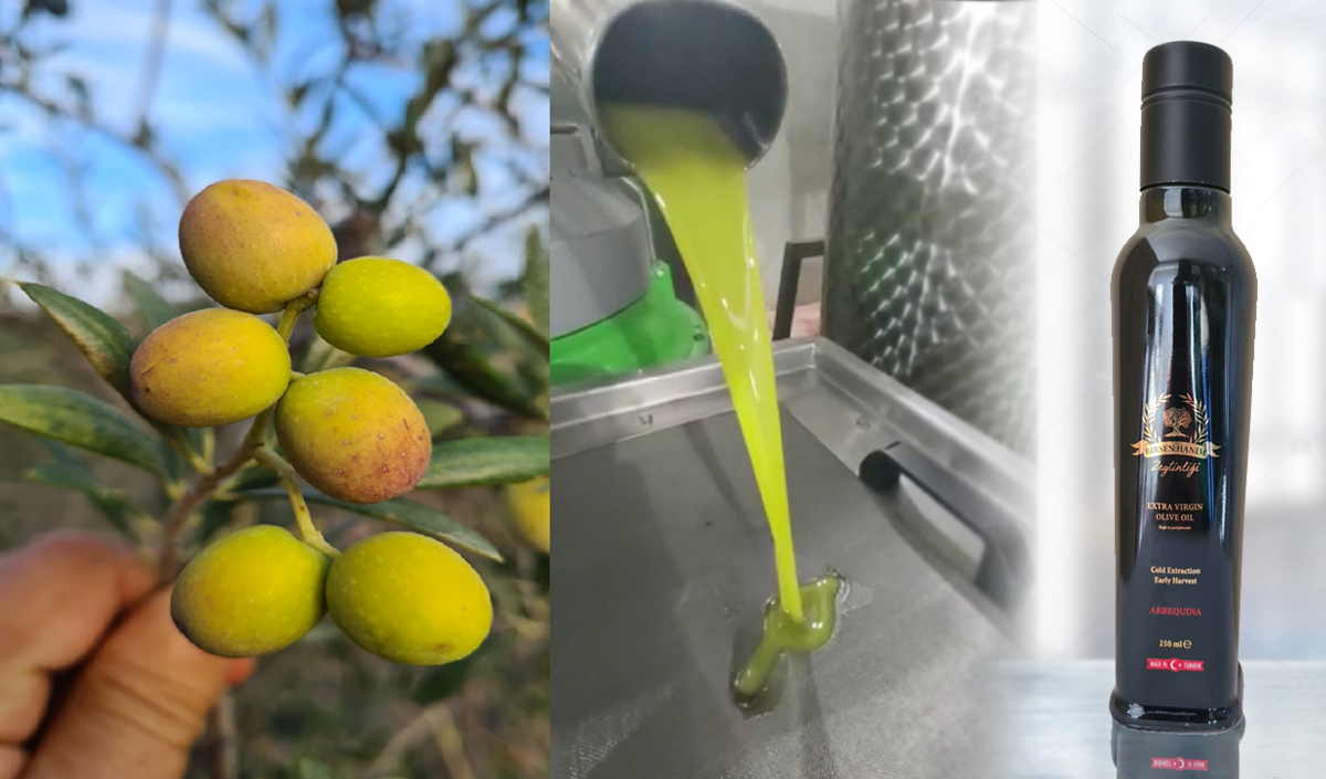 Cold pressed olive oil; At the beginning of October, when the olives are still green, they are carefully collected in the early harvest period, without touching the ground, and put in 25 kg boxes with perforated air permeability until they reach the factory. Without waiting, it is taken to the factory within 4 hours at the latest and tightened. Negative flavors are prevented from forming in the oil by storing, transporting and squeezing in 4 hours at the latest.